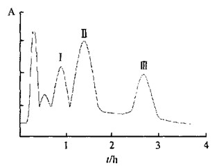 高速逆流色谱分离后显示有三个主要的峰(见图1) , 我们用分部收集器对每个峰都进行了收集, 间隔时间为6m in 每试管, 并用TLC 进行监测, 去掉组分重叠的试管结果得到20. 4m g 的组分É , 64. 8 m g 的组分Ê , 经HPLC 检测组分É 和Ê 的纯度分别为99. 6%和99. 3% , 组分Ë 16. 9m g 为一混合物。