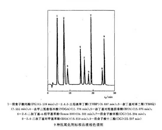 抗氧化剂标准品:没食子酸丙酯(PG)、2,4,5-三羟基苯丁酮(THBP)、叔丁基对苯二酚(TBHQ)、去甲二氢愈创木酸(NDGA)、叔丁基对羟基茴香醚(BHA)、2,6-二叔丁基-4-羟甲基苯酚(Ionox-100)、没食子酸辛酯(OG)、2,6-二叔丁基对甲基苯酚(BHT)、没食子酸十二酯(DG)。