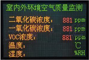 室内环境质量自动检测显示屏采用最先进的传感器,适时检测空气中各中气体的含量,环境质量自动检测显示屏最多可同时检测空气中的氧气、可燃气、氯气、氨气、硫化氢、氢气、氯化氢、甲醛、甲苯、VOC类等30多种气体。 室内环境质量自动检测显示屏适用场合室内公共场所使用的大/小型显示屏:购物中心、商场及超市、体育场馆、机场、火车站、地铁站、展览馆、宾馆、酒店、医院、图书馆、会议室、健身房、娱乐场所、银行、证券交易大厅、部队军区、政府机关、学院科研单位 “安泰”室内环境质量自动检测显示屏技术特点:实时监测:实时监测及LED显示室内环境中二氧化碳、一氧化碳等气体浓度值。标准配置:温度显示、湿度显示、时间日期显示,新闻滚动播出等技术领先:按照工业标准的室内外环境有毒有害气体监测系统,集传感技术、微处理器控制为一体的24小时监测及显示室内外各种气体浓度的系统。颜色组合 红、绿、黄内 尺 寸 912*608mm/912*456mm 边框尺寸 25*90mm 像素密度 128*192mm/112*192mm 网络功能:RS-485通讯接口,15KV防静电保护,独立地址设定,可与计算机及其他控制系统联网,实现对每个监测区域集中智能化管理。 室内环境质量自动检测显示屏传感技术: 1、采用NDIR红外自扩散式(二氧化碳传感器),15年长寿命,ABC Logic自标定技。 2、采用半导体或电化学检测原理(气体检测传感器)。 3、采用NTC热敏电阻及HS系列(温湿度传感器)电容传感器。测量范围:(参考各种气体传感器检测量程)集成度高:该系统集多种气体采集,数据传送、LED大屏显示为一体,提高集成度,简化系统组成,降低造价,满足各种应用场所使用。安装快捷:传感器部分与LED显示屏为两体式网络安装,现场装配,快捷简单,最大联接距离≤1500米产品型号 AT-N06 备选功能:提供其它气体的传感显示选择,提供不同规格的LED显示屏,预留了可扩展气体监测显示的接口和选择,使应用更加广泛