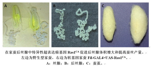 3月15日,Cell Research在线发表了中科院上海生命科学研究院植生生态所李胜研究员和西南大学夏庆友教授的共同研究成果,实验表明转基因家蚕提高蚕丝产量切实可行。在该研究中,博士生马俐等运用GAL4/UAS转基因系统,在家蚕后丝腺中特异性超表达癌基因Ras1CA,使蚕丝蛋白生产和蚕丝产量提高了60%,而食物消耗量仅增加20%,桑叶蚕丝转化效率提高了30%,在蚕业生产上呈现出非常良好的潜在应用前景。进一步研究发现,Ras1通过增大后丝腺体积和促进丝蛋白合成从而提高蚕丝产量,是家蚕后丝腺发育的主效调控基因之一。