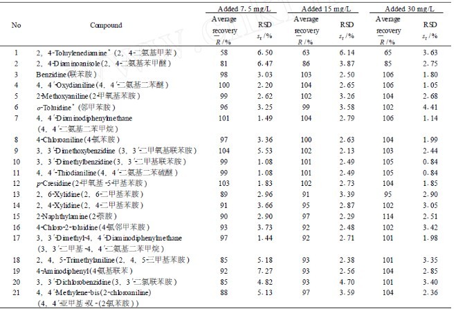用此方法测定纺织品中的偶氮含量,较为省时且易于操作。除3, 3′-二甲基联苯胺和4, 4′2 二氨基二苯硫醚色谱峰(图1中10、11号峰)重叠, 2, 6二甲基苯胺和2, 4二甲基苯胺(图1中13、14号峰)有少于重叠外,其它化合物均取得了很好的分离效果。以pH 6.0的柠檬酸盐缓冲溶液模拟人体的汗液环境, 分别加入7.5、15、30 mg/L 3个水平的芳香胺标准品进行回收实验, 每一水平分别做6个平行样品, 相对标准偏差和平均回收率数据见表1。应用高效液相色谱法分离检测了23种混合芳香胺, 取得了很好的分离效果, 满足了国内外相关标准及法规的新要求。