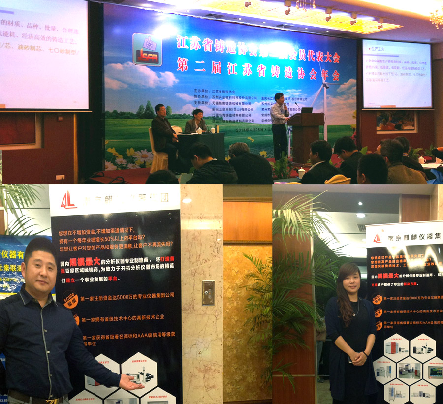 2014年4月25日,江苏省铸造协会召开第二届会员代表大会暨第二届江苏省铸造协会年会在无锡召开,参会人员主要为江苏省铸协会员代表、政府主管部门领导、中铸协及分会代表、各地方协会代表、行业媒体代表、专家学者、业界同仁等。南京麒麟分析仪器有限公司也参加了此次盛会。会议选举产生新一届理事会。江苏省铸造行业准入申报情况报告及申报咨询、铸造专业学术报告,并且表彰了江苏省铸造行业“十强企业”、颁发个人奖项。