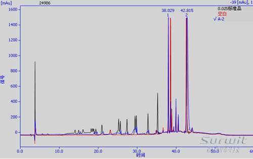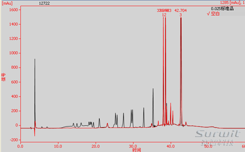 方法包衍生方法:将恒温水浴锅预热至50±1℃,分别将A、B两种衍生试剂用稀释至原来浓度的1/5倍。精密量取上述对照品1ml,至于试管中,加入稀释后的A溶液0.5ml和稀释后的B溶液0.5ml,摇匀;在50±1℃的水浴中加热45分钟,取出,加入正己烷溶液1ml,振摇;并用孔径为0.45μm有机膜过滤,放置30min后,取澄清的下层液进行分析实验。供试品的衍生步骤与对照品相同。