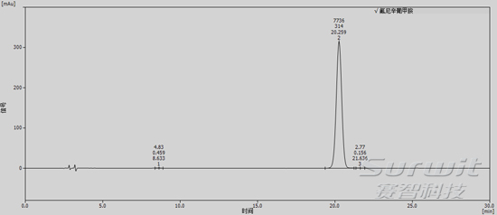 精密量取氟尼辛葡甲胺对照品适量,置容量瓶,加适量甲醇-水(7:3),超声溶解,并用甲醇-水(7:3)稀释成每1ml中约含氟尼辛葡甲胺1mg的溶液,摇匀,用0.45µm的有机系滤膜过滤,精密量取20µL,注入液相色谱仪,记录色谱图。