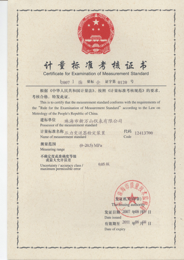 计量标准考核证书