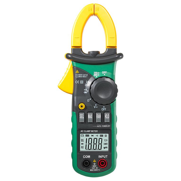技术参数:交流电流:2A/20A/200A/600A±2.0%直流电压:200mV/2V/20V/200V/600V±0.7%交流电压:200mV/2V/20V/200V/600V±0.8%电阻:200Ω/2kΩ/20kΩ/200kΩ/2MΩ/20MΩ±1.2%电源:1.5V(AAA)×3外形尺寸:208×78×35 mm重量:约240g(不含电池)