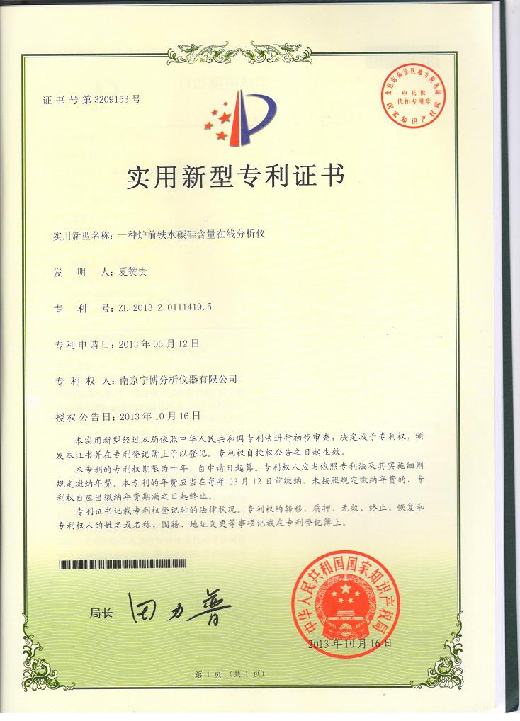 经有关部门严格的考核、评审,南京宁博分析仪器有限公司荣获了由中华人民共和国国家知识产权局颁发的炉前铁水碳硅分析仪实用新型专利证书。 在此喜庆之际,南京宁博分析仪器有限司全体同仁向全国各界朋友、领导致以崇高的敬意和衷心的感谢!
