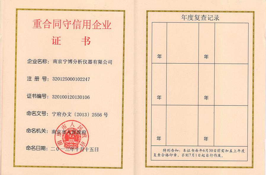 南京宁博分析仪器有限公司连年荣获高淳区人民政府的“重合同守信用企业”荣誉,今年又荣获了市级“重合同守信用企业”荣誉,这是对南京宁博分析仪器有限公司在诚信经营、产品质量、售后服务、规范合同管理等方面所取得的成绩的再一次肯定!