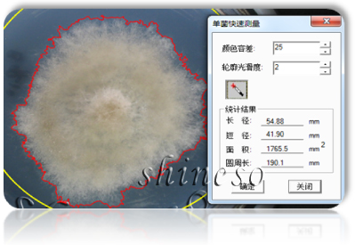 由于多数霉菌菌落蔓延、疏松、边缘发散不规则,测量的人为误差大,效率低。迅数“霉菌一键测量”模块,只需用“魔棒”在菌落边缘点击一次,大霉菌的面积、周长、长径、短径瞬间测出。