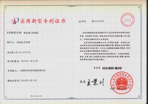 伍丰液相色谱仪单向阀的专利证书